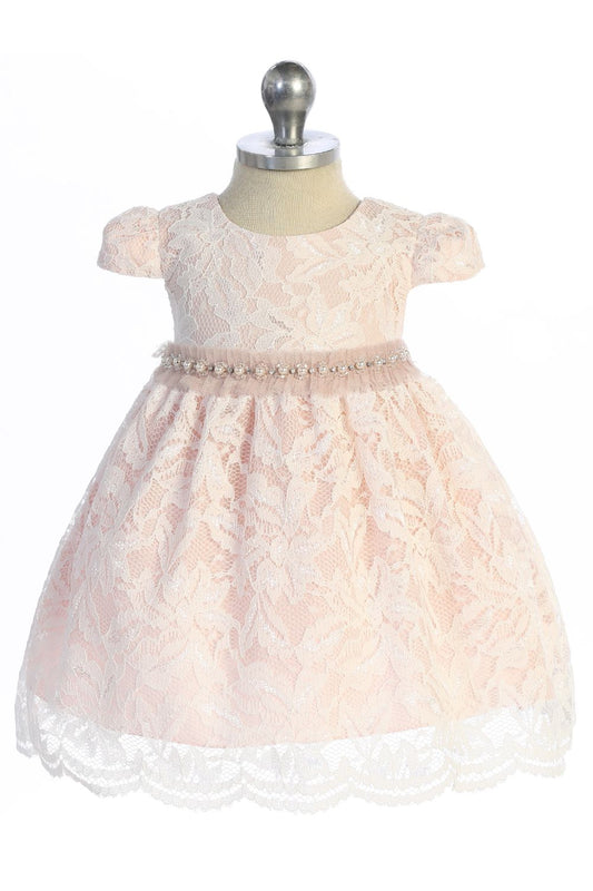 532-B All Lace Baby Dress with V Back & Bow and Mesh Pearl Trim