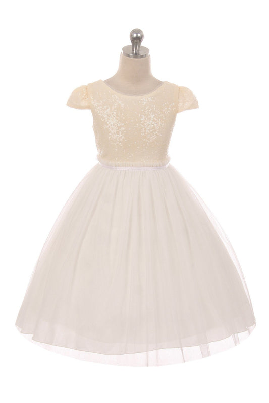 410 Ivory Sequin Mesh Pleated Girls Dress