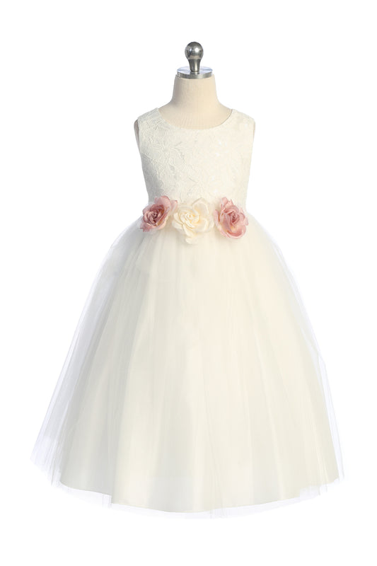 524-F Long Lace Illusion Girls Dress with Flowers
