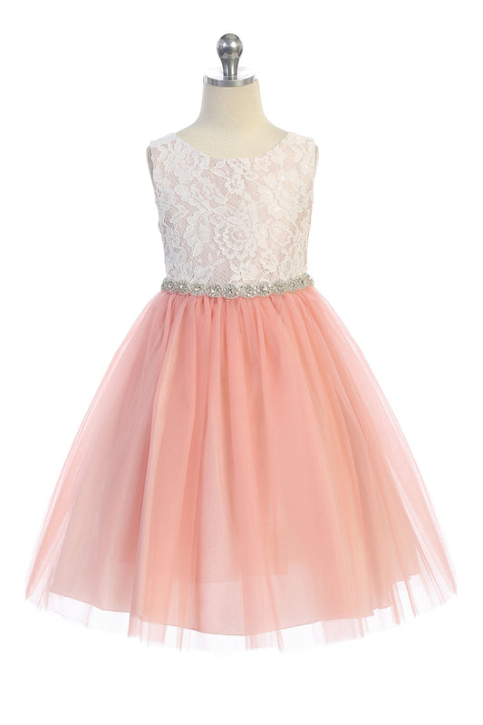 456-B Lace Illusion Girls Dress with Mesh Pearl Trim